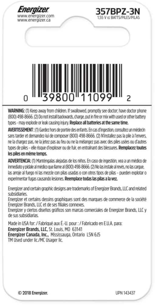 - Energizer 357/303 Silver Oxide Button Cell 1.5-Volt Battery delivers long-lasting, dependable power to your button-battery-operated devices, like medical devices, calculators, toys, and watches